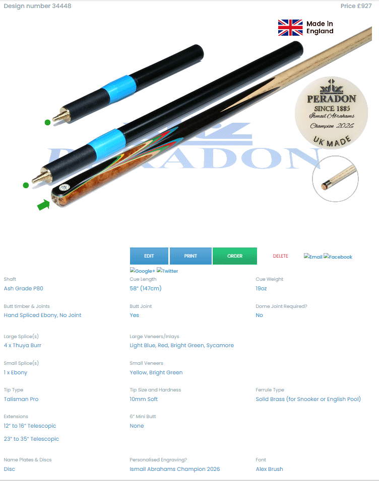 Please note that Peradon Custom Cues take around 6-10 weeks to complete dependant on the complexity of the design required.