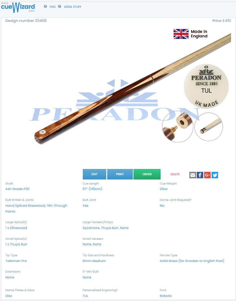 Peradon Cue Wizard Bespoke Cue Design Number 33408 with 8% ABC Snooker Discount.